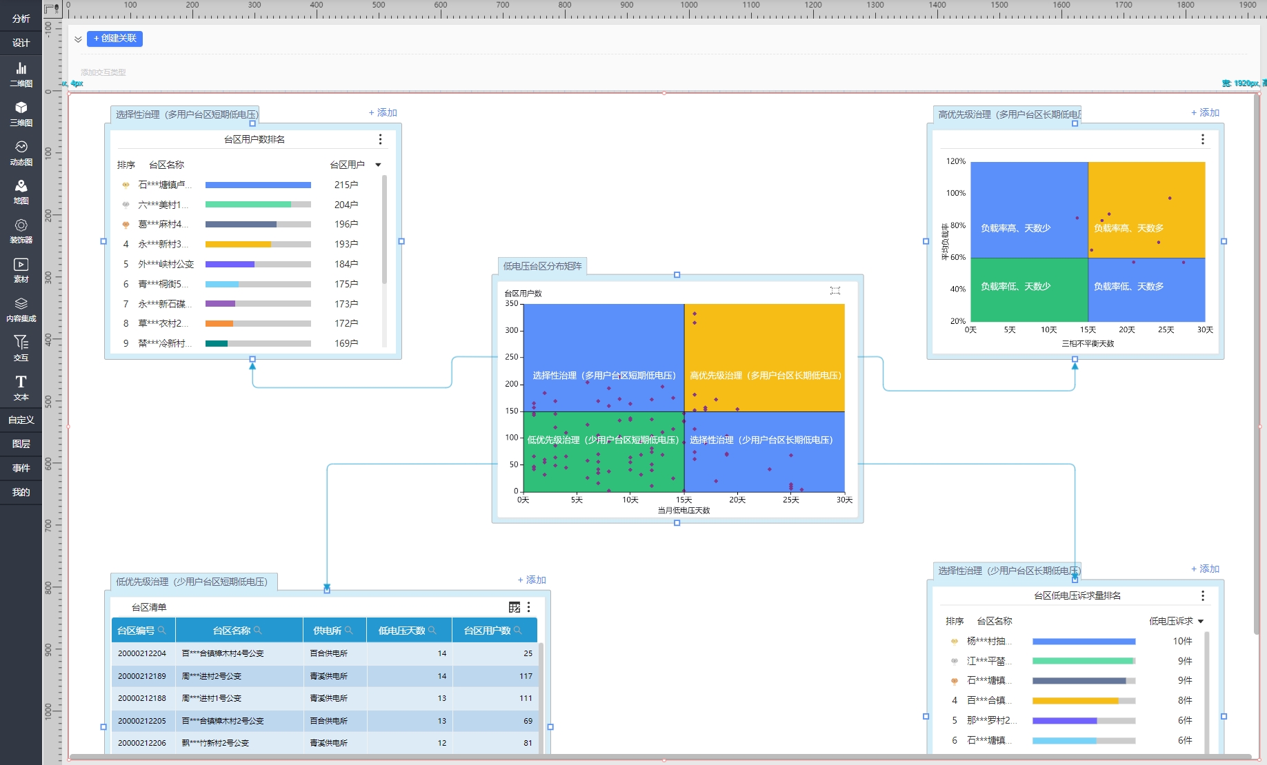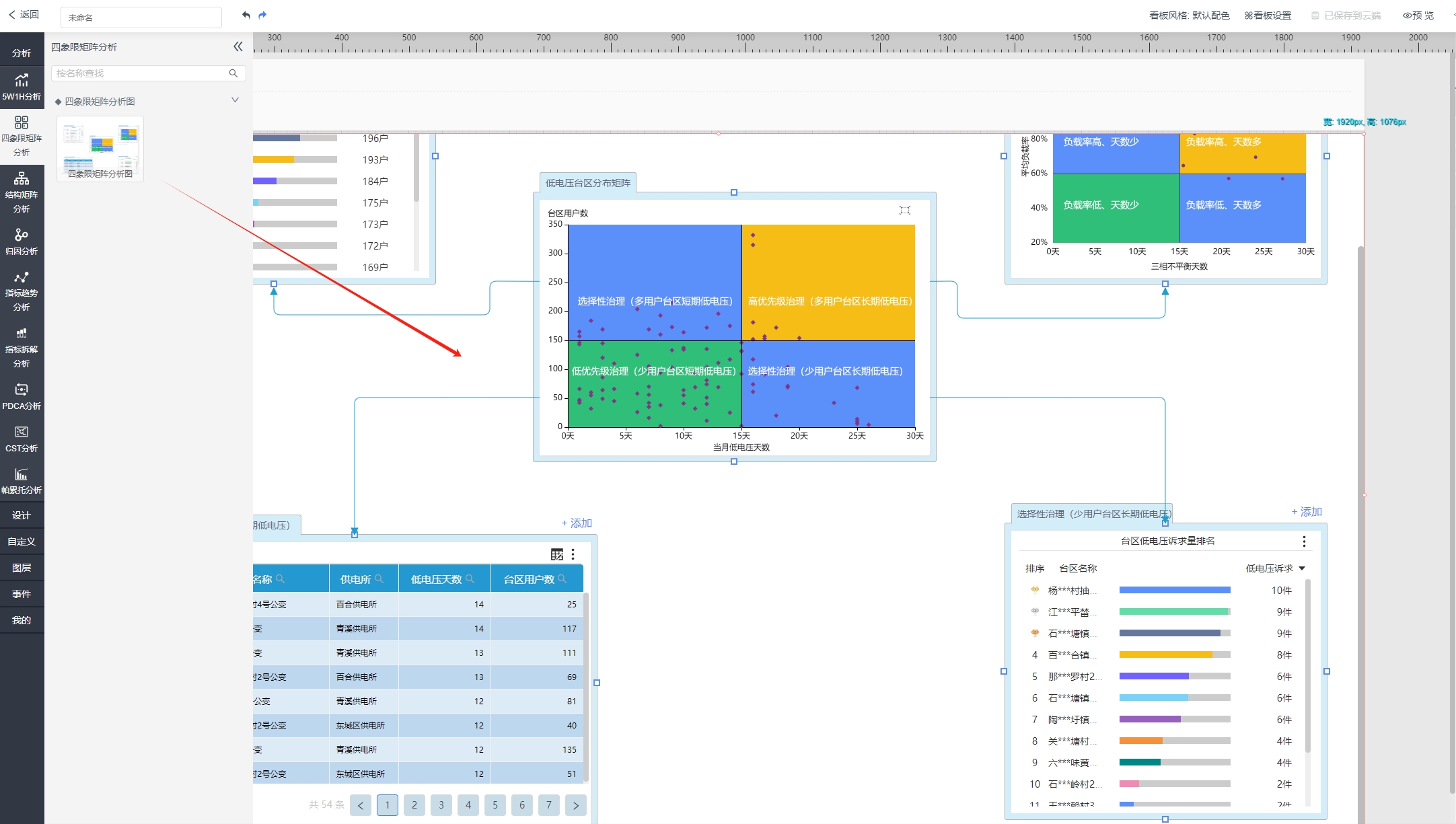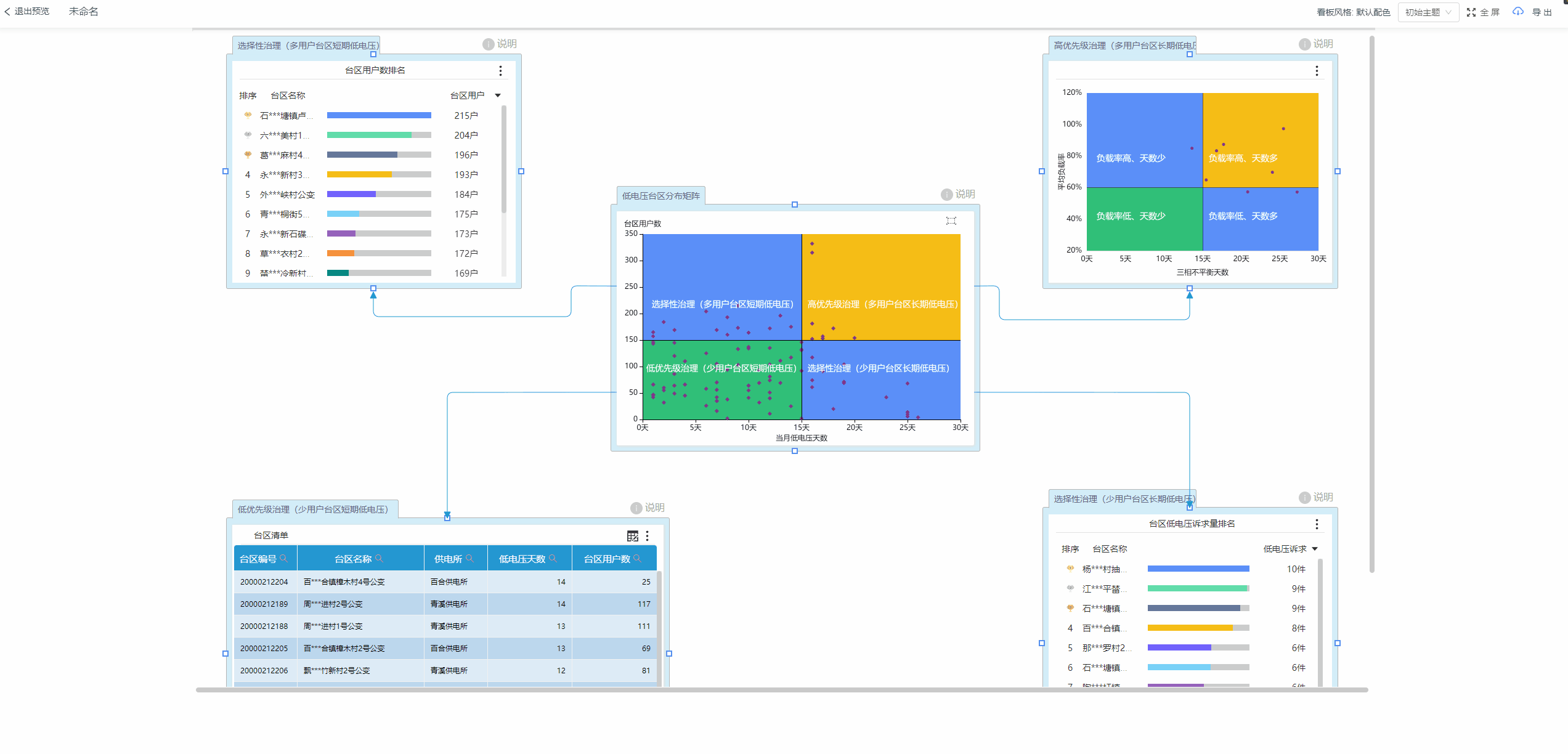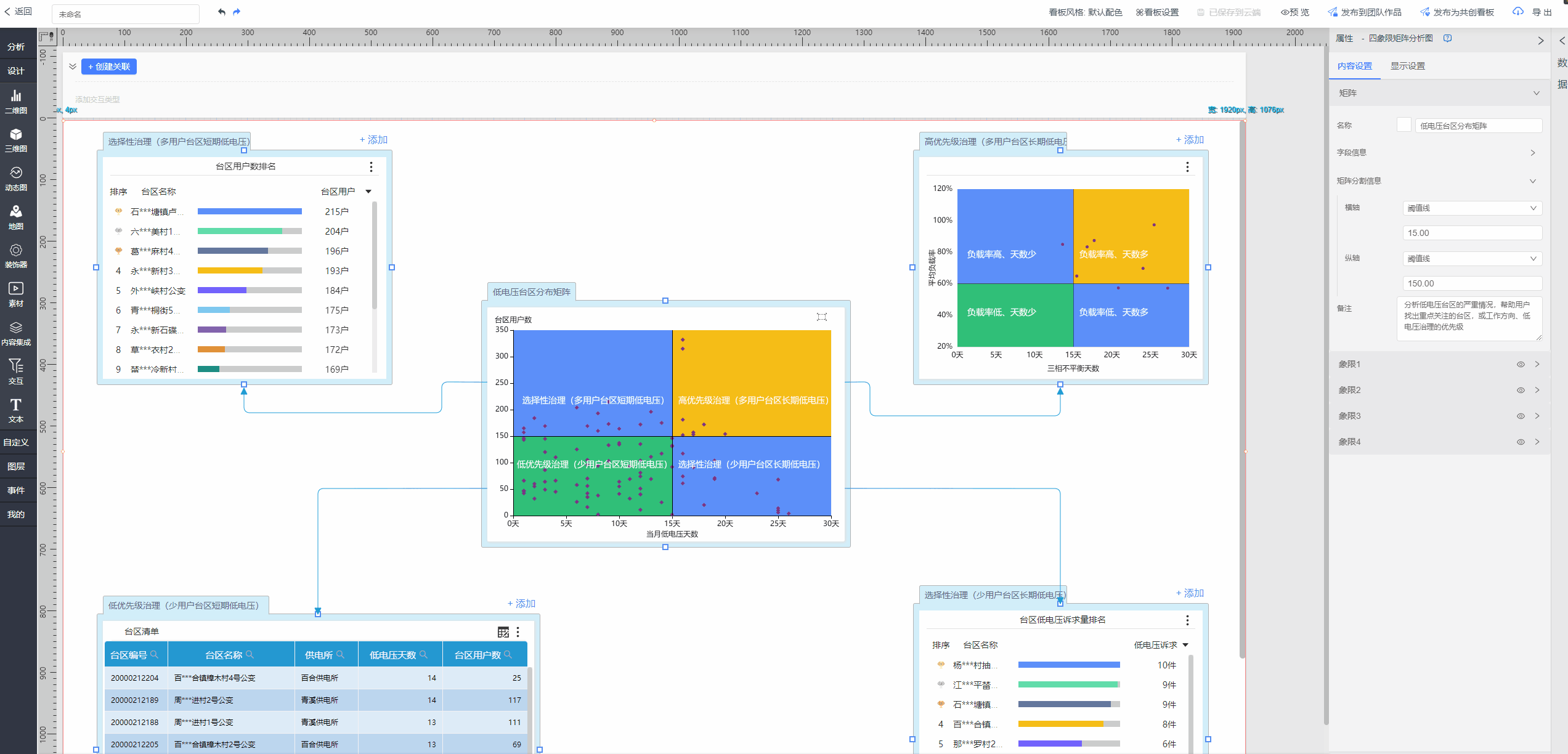 那么,在了解什么是四象限分析法后,我们该如何在星河可视化共创分析平台中操作四象限分析法呢?如何把四象限分析法运用到实际工作中去呢?以分析低电压台区分布为例,我们如何结合星河可视化共创分析平台中的分析模式去分析工作中的难题。