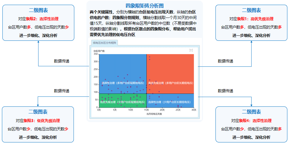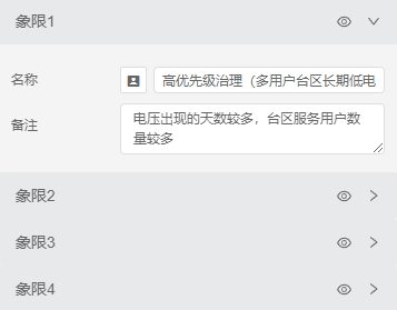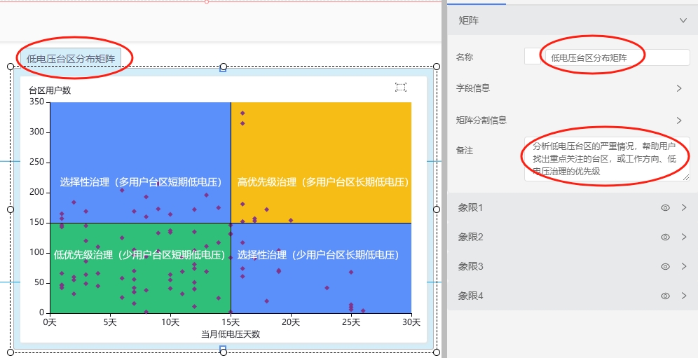 最后,配置完二级图表后,我们需要给各象限加上相关的名称,比如在象限1中命名为“高优先级治理(多用户台区长期低电压)”,并把相关备注打上去,这样一个象限的命名就完成了。
